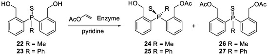 Because the results obtained during desymmetrisation of bis (2-hydroxymethyl-phenyl)phosphines 12 and 13 were acceptable, but not very satisfactory and, moreover, some byproducts arising from oxidation phosphines were formed, we decided to synthesize appropriate phosphine sulfides 22 and 23. Prochiral bis (2-hydroxymethylphenyl)phosphines 12 and 13 were treated with elemental sulfur to give the appropriate phosphine sulfides 22 and 23 (Scheme 5).