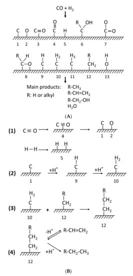 (A) Observed and proposed chemisorbed species during Fischer–Tropsch. Synthesis; (B) Reaction scheme of the Fischer–Tropsch reaction according to carbide mechanism [15].