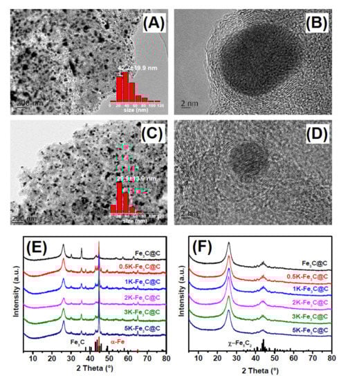 TEM and HRTEM images of (A,B) the as-prepared unpromoted Fe3C@C catalyst and (C,D) as-prepared 2KFe3C@C catalyst; XRD patterns of the (E) calcined catalysts, and (F) reduced catalysts with different qualities of potassium promoter (0–5 wt% K). XRD patterns of the reduced catalysts were performed after reduction by H2/CO = 1 syngas flow for 12 h at 350 °C and passivation by 1% O2/N2 gas flow for 2 h in a quartz tube [56].