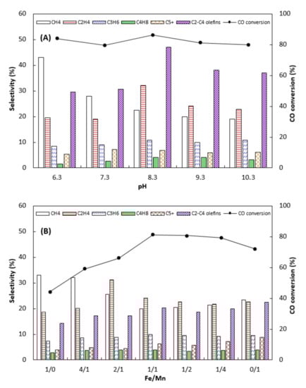 The effect of pH was also investigated for the Fe/Mn catalyst (Fe/Mn= 1/1, 70 °C, 3 h aging time), using pH in the range of 6.3 to 10.3 [70]. The catalytic performances in the FT reaction (Figure 5A) showed that the highest CO conversion and C2–C4 olefins were obtained at a pH of 8.3. Different phases, including MnO, FeO, and CFe2.5 were identified in this catalyst, and all these oxidic and carbide phases are active in the FT reaction. The effect of the Fe/Mn ratio was also studied as an important parameter (Figure 5B). The catalysts were prepared at 70 °C, pH = 8.3, aging time of 3 h, with the Fe/Mn ratios varying from 100% Fe to 100% Mn. The catalyst with the Fe/Mn molar ratio of 1/1 revealed the highest CO conversion and the lowest methane formation. The XRD patterns of the calcined samples revealed that the 100%Fe catalyst contained Fe2O3 (rhombohedral) phase and the 100%Mn catalyst contained Mn2O3 (cubic) phase, while for the other samples, different phases, including both Mn2O3 (cubic) and Fe2O3 (rhombohedral), were identified. The Fe/Mn (Fe/Mn = 1/1) catalyst, after the FT reaction, was characterized by XRD to identify the formed phases, and MnO (cubic), FeO (cubic), and CFe2.5 (monoclinic) phases were detected in this sample [70].