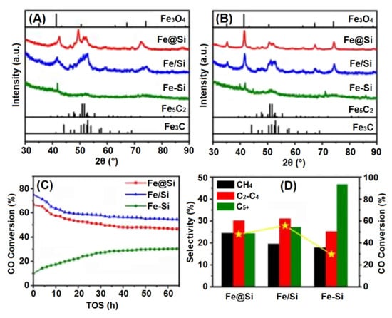 O’Brien et al. [73] reported that iron-based catalysts are more productive than a similar mass of cobalt-based catalysts for CO conversions by up to 50%. The unsupported iron catalyst disintegrated after 24 h of reaction, while the integrity of the catalysts supported on different materials (alumina, silica, and magnesium aluminate) was preserved during hundreds of hours of FT reaction in the slurry reactor. Amongst different supports in this study, the silica-supported catalyst showed the lowest disintegration in this reaction [73]. Zhang et al. [82] compared the physico-chemical properties and the catalytic activity of the core–shell structure Fe@Si catalyst with the catalysts prepared by the conventional methods of impregnation (Fe/Si) and precipitation (Fe-Si). In this study, a two-step process (including solvothermal synthesis and the Stöber method) was used for the synthesis of the Fe@Si catalyst. The core–shell Fe@Si catalysts, with a unique structure, can prevent the agglomeration of the active metals. Sintering of the iron particles is a common phenomenon in the SiO2-supported iron catalysts prepared by impregnation or precipitation method for FT reaction. Due to the confining effect of the SiO2 shell, iron particles sintering would be decreased in core–shell structure Fe@Si catalysts. However, the Fe–SiO2 interaction in the core–shell structure Fe@Si catalyst could affect the metal dispersion and reduction behavior of the catalyst. The XRD analysis of the catalysts activated by syngas (H2/CO = 2) at 350 °C for 24 h (Figure 6A) confirmed the formation of iron carbides on both Fe@Si and Fe/Si catalysts, while due to the stronger Fe–SiO2 interaction in Fe-Si catalyst, the peaks were not very obvious, and this strong MSI caused a decrease in the degree of reduction and carburization in Fe-Si catalyst. It was suggested that the synthesis of the core–shell structure catalysts with larger pore size and thin SiO2 shell might be a promising method to overcome these drawbacks of the catalysts. It has been frequently reported that the iron carbides are the active phase for iron-based catalysts in FT reaction, and it is a linear correlation between the catalyst activity and carbide content of the catalyst. The iron carbides content of the catalysts after activation were in the following order: Fe/Si (55.7%) > Fe@Si (52.01%) > Fe-Si (29.67%), and as expected, the catalyst activity also followed the same trend.