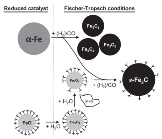 In the study by Chang e al. [87], the role of different types of iron carbides (ε-Fe2C, χ-Fe5C2, and Fe7C3) on the catalytic performance of the Fe/SiO2 was investigated. Changing the reducing agent resulted in the formation of different carbide phases of χ-Fe5C2 + ε-Fe2C, χ-Fe5C2 + Fe7C3, and χ-Fe5C2 when H2, CO, and syngas were used as reducing agents, respectively. The catalyst activities were evaluated at 260 °C, 3 MPa, and H2/CO of 2, and the results were in the following order: Fe/SiO2 (CO activated) > Fe/SiO2 (H2 activated) > Fe/SiO2 (syngas activated). The catalytic activity is related to the particle size, the carbide phase and its contents. The catalyst activity could be enhanced in the presence of Fe7C3, while the presence of ε-Fe2C phase led to the higher selectivity to C5+ and lower methane formation.