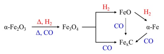 Schematic illustration of the activation of iron oxides using H2 or CO [77].