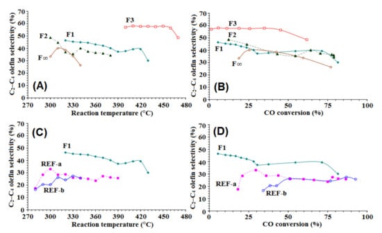 C2–C4 olefin selectivity of reduced catalysts at (A,C) different reaction temperatures and (B,D) different CO conversions [97].