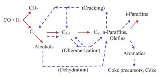 It was reported that the addition of zeolite to the AC-supported iron catalysts in a dual-bed reactor (separate-beds) could alter the product distributions by cracking long-chain hydrocarbons, isomerization of n-paraffins, oligomerization of olefins, and formation of aromatics [110,111]. The C2–C4 olefins content in the products decreased by the addition of ZSM-5 due to the higher possibility of oligomerization in the presence of ZSM-5, and the olefin formation decreased by the further increase in the amount of ZSM-5. The FT and WGS reaction rates increased by increasing the temperature from 280 °C to 300 °C, but further temperature increases did not enhance the reaction rates. Formation of aromatics increased sharply in the presence of zeolite, and by increasing the reaction temperature from 280 °C to 300 °C, total C2–C4 hydrocarbons and aromatics concentrations from 2.25 to 6.05 (g carbon/day) and 262 to 1762 (mg carbon/day), respectively [110]. A summary of reactions occurring over the catalyst (Fe/AC and the zeolite) is shown in Figure 10 [111]. Syngas is converted to C1–C5, C6+, alcohols, and light olefins under an iron-based catalyst.