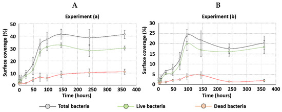 Surface coverage percentage of the anode as a function of time for live bacteria (green), dead bacteria (red) and total biofilm coverage (black). Points represent the mean at each time of (A) the four MFCs for the experiment (a) and (B) the four for experiment (b). Error bars represent the standard deviation.