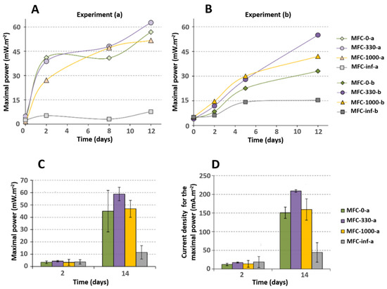 (A) Maximal power density of the experiment (a) as a function of time. (B) Maximal power density of the experiment (b) in function of the time. (C) Maximal power density mean of the experiments (a) and (b). (D) Current density means of the experiments (a) and (b) corresponding to the maximal power.