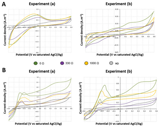 (A) Cyclic voltammetry at 10 mV·s−1 of MFC anodes (A) on the 2nd day and (B) on the 15th day of the experiments (a) and (b).