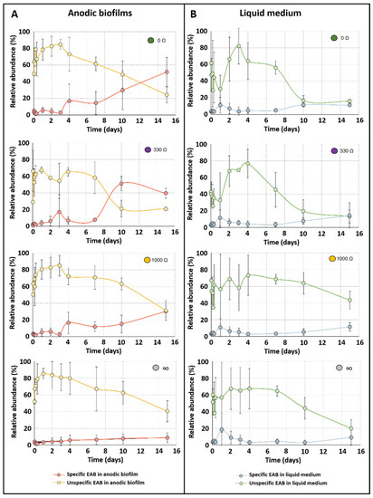 Relative abundance of specific EAB and nonspecific EAB as a function of time for anodic biofilms (A) and liquid medium (B). The points represent the means of samples from the experiments (a) and (b). The error bars represent the standard errors of samples from the experiments (a) and (b).