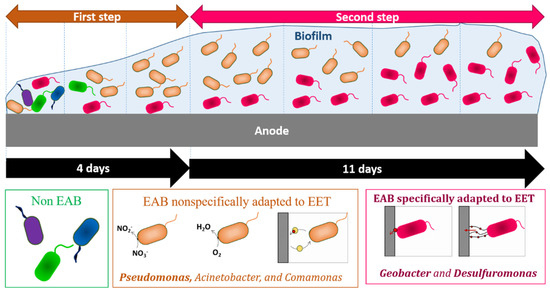 Schematic representation of two steps of competition between nonspecific and specific EAB during anodic biofilm formation.