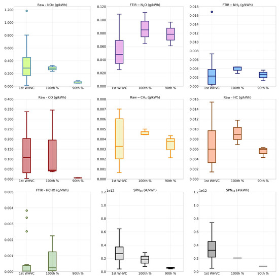 From the analysis of Figure 1, it is evident that the overall emissions of NH3, CH4, HC, HCHO are generally low, with very few cases in which 10 mg/kWh are exceeded. For this reason, in the following, the discussion focuses on the other pollutants, although all the data measured are available in Supplementary Materials for reference. It should be noted that, as already discussed in the “Evaluation Methodology” Section 2.5, no correction was performed for any of the instruments used in the campaign and, in this respect, all the data herein reported are to be considered “as measured”. It can be also noticed that SPN23 and SPN10 emissions are similar, with an additional fraction due to finer particles in the order of 15–25%; see also the detailed analysis in Figure S4 in Supplementary Materials. For this reason, in the following sections, the analysis focuses on NOx, N2O, CO, and SPN23, for which considerations will be less influenced by the experimental error, due to the higher quantities measured and due to the availability of SPN23 for more tests (as detailed in the “VELA7 Heavy-Duty Test Cell” Section 2.2). In addition, the latter was less influenced by the experimental uncertainties due to possible interference from volatiles [14] as the system had an evaporation tube and not a catalytic stripper.