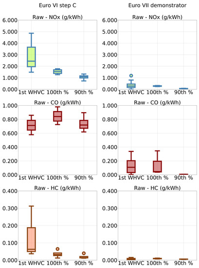Figure 2 reports a comparison between a Euro VI step C vehicle and the vehicle object of this study. Note that for each pollutant, right panels include the same data already discussed in the previous section and are herein reported only for ease of comparison.