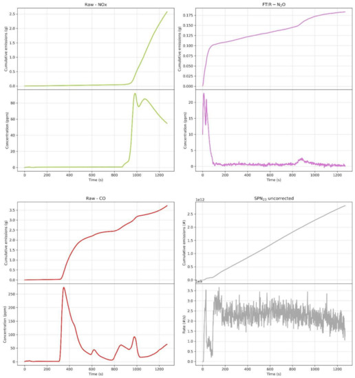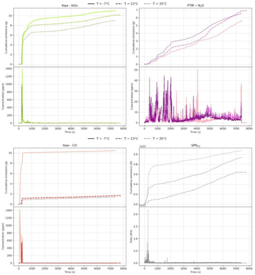The situation was qualitatively similar for CO, in which however the impact of low temperature was much more pronounced. Indeed, colder emissions at −7 °C were approximately one order of magnitude larger with respect to those in milder conditions (10.5 g at −7 °C vs. 1.5 g at 35 °C). Additionally, in this case, high cold start emissions were predominant and likely related to inactive catalysts due to low temperature. It is important to mention that, in this period, emissions were essentially uncontrolled and equal to engine out emissions.