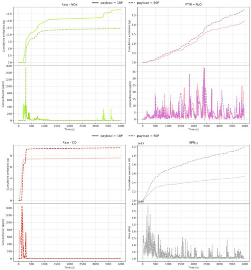 Figure 4 shows the effect of payload on the emissions of selected pollutants during cold urban delivery cycles conducted at −7 °C with a conditioned emission control system.
