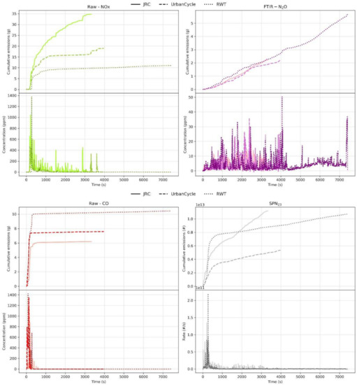 SPN23 emissions trends were different for the three cycles. While at the RWT and the urban cycle, cold start emissions dominated the total emitted particles (>60% during the first 500 s), this was not the case for the JRC cycle where SPN23 emissions continued to increase during all its duration. The rationale was that during the JRC cycle, a stop and go cycle, SPN was emitted at each acceleration, and, thus, the cumulative SPN emissions continued to increase.
