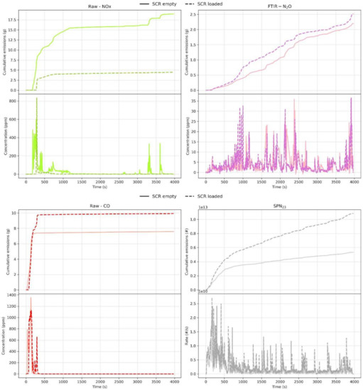 Figure 7 shows the impact of the conditioning procedure described in the “Vehicle and Tests” Section 2.1. This consisted of driving the vehicle for approximately 30 min at high speed (70 km/h) with DEF dosing disabled. This promoted a passive regeneration of the DPF, avoided any clogging of the exhaust lines, consuming at the same time the NH3 stored on the two SCR units. This also allowed the system to have similar starting conditions for the catalysts.