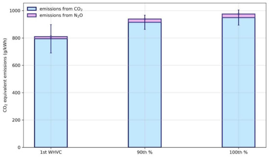 N2O and NH3, despite the very low emissions of the latter, showed a different trend. Indeed, emissions factors were comparable in both short and long tests, without a clear distinction between the 100th and 90th percentiles. The median N2O emissions for short tests were in the order of 42 mg/kWh, with variability between 10 mg/kWh and 109 mg/kWh. Long test emissions for the 100th and 90th cumulative percentiles were, respectively, 85 mg/kWh (variation 64–111 mg/kWh) and 78 mg/kWh (variation 61–97 mg/kWh). This indicates fairly continuous and low emissions, without significantly different events in the cycle such as cold start vs. stabilised hot emissions. This is in line with what was already reported in the literature [2,15] and consistent with possible pathways for N2O production in Diesel emission control systems. Indeed, these are nowadays characterised by the requirement for very low NOx tailpipe emissions, requiring active DOCs, and an increase in the DEF injection rates together with the necessity of limiting any NH3 slip at the tailpipe.