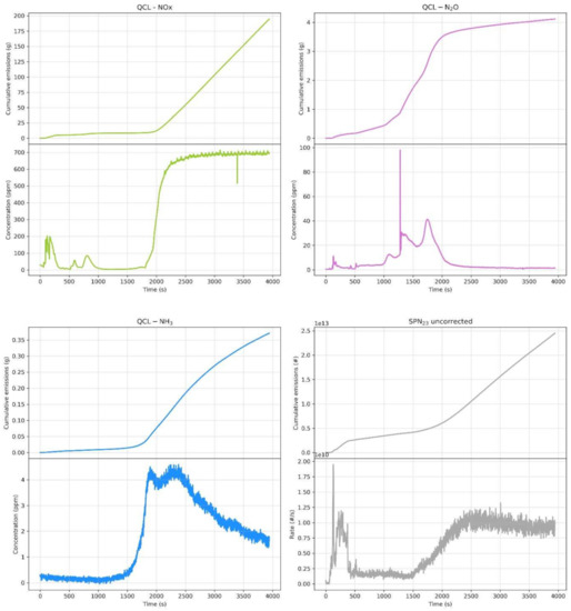 N2O emissions showed a peak of 20 ppm right at the very beginning of the test with very low values everywhere else. This initial peak was expected to be related to a continuous N2O accumulation in the emission control system during the cool down until the temperature was sufficiently high to promote catalytic reactions, even with engine off. As soon as the engine was re-ignited, the N2O accumulated was purged by the exhaust gases flowing through the system, resulting in a peak at test start. The accumulation in the sampling lines was, however, negligible. Indeed, by simply disconnecting them and leaving the instrument sampling, the measured concentration dropped to zero immediately.