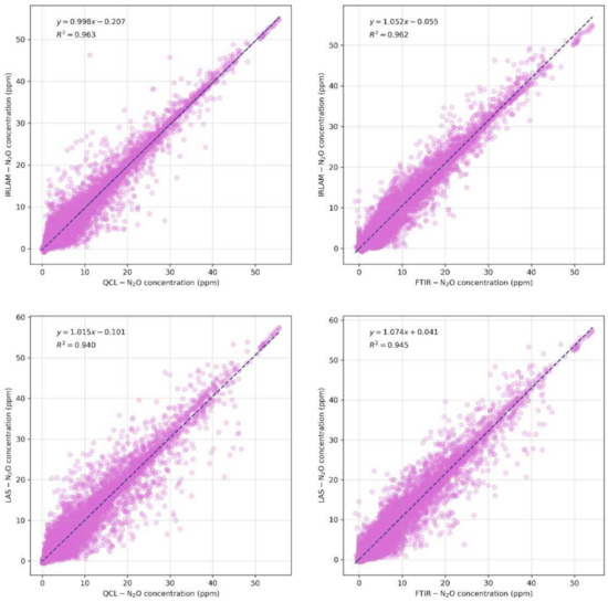 In addition, specifically for this campaign, a laboratory grade Quantum Cascade Laser Infrared (QCL-IR) spectrometer (HORIBA MEXA 1400QL-NX, Horiba Ltd., Kyoto, Japan) was used to measure NO, NO2, N2O, and NH3. This was done to collect additional data to better assess the performances of two new mobile instruments currently under development and of potential interest for Euro 7/VII regulation. These instruments are described in the next section. The QCL system consisted of three major components: a main control unit, an analyser unit, and a heated filter containing a quartz element specifically designed to minimise the adsorption of the ammonia molecules present in the exhaust gas. The filter was connected to the analyser unit via a vacuum sample transfer line maintained at a temperature of 113 °C. The sampling of the exhaust was conducted via a stainless-steel sampling probe covered with a heated jacket in order to avoid cold spots. The analyser had an acquisition frequency of 10 Hz.