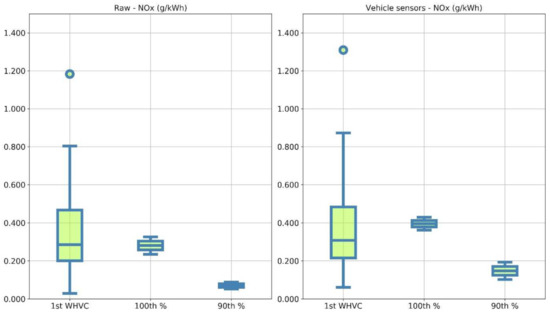 In all other cases, moving windows (MWs) of length equal to the reference work were computed, starting from the beginning of the test and moving with time increments of 1 s, without any exclusion criteria (e.g., for average power). This was at variance with what is currently specified in regulation 595/2009 [3] and subsequent amendments. Such an approach implied that each window had, in this specific case, a length of 29.4 kWh and started 1 s after the previous one in terms of time. It should be noticed that each window may have had in principle a different time duration. Once all the windows were determined, the 100th and 90th percentiles of the cumulative windows distribution were computed and reported.