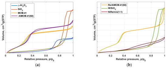 The physisorption profiles of the catalysts largely correspond to the respective supports. The rhenium-loaded catalyst (Re/AlMCM-41(60)) shows similar hysteresis curves such as the AlMCM-41 but is deformed in the H3 hysteresis section because of larger pore size. The adsorption isotherm of the tungsten catalyst is very similar to silicon dioxide with a slightly changed pore system (Figure 2b, Table 2). The bimetallic NiRe/mix (1:1) catalyst presents a different form. This hysteresis between 0.43–0.99 of relative pressure is a combination of two hysteresis (MCM-41 and γ-Al2O3) in an overlapped region.