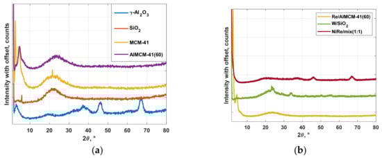 XRD patterns for (a) the applied support materials and (b) catalysts for the metathesis of ethene and trans-butene in the range of = 0–80°.