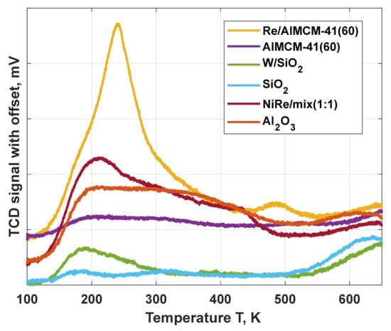 The results of the NH3-TPD measurements to characterize the surface acidity of the investigated catalysts are shown in Figure 4. The Re catalysts on aluminized MCM-41 and NiRe on mixed support present stronger acidity compared to the W/SiO2. The reason is the non-acidity of the silica support [,], the low-temperature peak corresponded to weak acid sites caused by the containing tungsten oxide. Additionally, a signal emerges above 500 °C in Figure 4 for the blue and green curves. which could be an indication of increased catalytic activity.