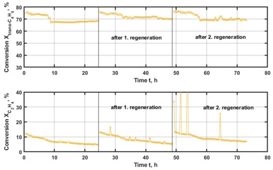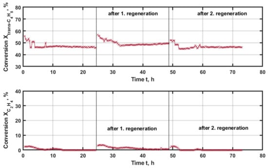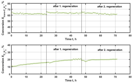 Conversion of the applied reactants trans-butene (upper graph) and ethene (lower graph) with time-on-stream (TOS) applying W/SiO2 as the catalyst at 600 °C and 500 kgcat∙s∙m−3, with regeneration at 500 °C and 20% oxygen for 3 h.