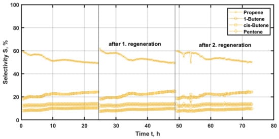 The W/SiO2 system is analyzed analogously (Figure 11). This catalyst forms 1-butene as the main product, followed by propene, cis-butene and traces of pentene. The selectivity of propene drops from 32% to 28%. Cis-butene isomers increase analogously from 37% and 40%. The selectivity of the isomers then drops to 30% for 1-butene and 23% for cis-butene. In parallel, the selectivity for pentene remains constant at about 3% and the propene selectivity rises to about 44%. After the subsequent regeneration, the initial propene selectivity is still at 40%. In the following, the profile approaches a local minimum of 38% and afterwards, increases to 50% of propene selectivity. The enhanced conversion of ethene is beneficial for the generation of propene via the cross-metathesis, while less butene is agglomerated by conversion in this reaction. As a result, the selectivity with respect to the butene isomer gradually decreases. This is related to the fact, that the thermodynamic equilibrium shifts towards trans-butene, which is converted in the metathesis.