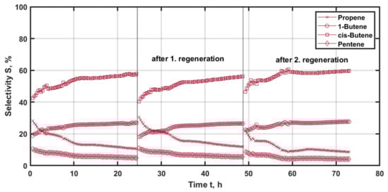 After the first regeneration, cis-butene is initially formed with 40% of selectivity and increases to 56%. 1-butene follows an equivalent course from a value of 18 to 26%. The desired product propene starts at 30% and decreases continuously to about 12%. The selectivity of hexene and pentene increases by about 3%. The analyzed results support the conclusion that there is an enhancement regarding isomerization and cross-metathesis.
