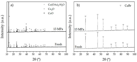 XRD spectra of fresh catalysts and after scCO2 at 13 MPa and 35 °C (a) Cu(CH3COO)2·H2O and (b) CuBr.