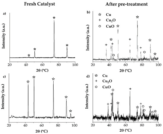 XRD profiles of Cu Wire and Cu Plate before pre-treatment show the peaks centered at about at 43.54°, 50.44°, 74.04° and 90.25°, attributed to the (111), (200), (220) and (311) hkl reflection planes, respectively, of pure metallic copper. It can be seen how the intensity corresponding to the pure copper peaks decreases after pre-treatment in both catalysts.