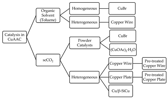 CuAAC click reactions have been explored and analyzed in many different green solvents and reaction media, including scCO2. In 2009, Grignard et al. [16,17] reported the first example of modification of aliphatic polyesters via CuAAC in scCO2 and the removal of the catalyst (CuI) using scCO2 extraction. Later, the same authors prepared a polymer with a chain-end functionality through CuAAC in scCO2. In 2015, Zhang et al. [18] developed an efficient protocol for the CuAAC catalyzed by Cu(CH3COO)2·H2O in supercritical carbon dioxide in the absence of the ligand. A recent work from our group [19] showed the viability of CuAAC with a polyether in scCO2 using acetate of copper monohydrate as a catalyst. To the best of our knowledge, only four papers can be found in the literature where the CuAAC reaction is studied using scCO2 as reaction media.