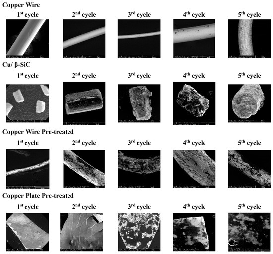 The images of Cu/β-SiC pellets show how the product adheres to the pellet, making it hard to clean the catalyst for another cycle. The pre-treated catalysts exhibited severe weathering and considerable changes in their structures. In fact, the SEM images showed the weathering and fracture of the copper plate from the second cycle onwards and from the third cycle for copper wire.
