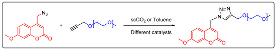 Considering the good physical and toxicological properties of scCO2, we studied the CuAAC reaction between PEG and coumarin using different catalysts at different times and in the absence of a ligand or base using scCO2 as reaction media, as shown in Table 2.