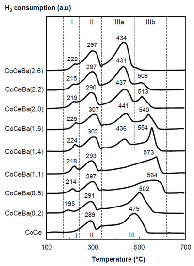 Under the measurement conditions (temperature increase from 30 to 700 °C at a constant rate of 10 °C min−1, 10 vol.% H2/Ar), cerium (IV) oxide did not undergo reduction, which has been reported in previous studies [15,28]. It is noted that the introduction of the barium promoter to the systems containing cobalt (II,III) oxide and cerium (IV) oxide causes a change in the course of their reduction (Figure 1). The TPR profiles of the samples containing barium show a small peak (I) of constant area and maximum in the range of 210 °C ± 15 °C, which may be related to the decomposition of the barium salt. The position of peak II is not influenced by the barium content in the system. Its maximum occurs at the temperature of 299 °C ± 8 °C. However, in the case of the samples containing barium in the amount of 1.4 mmol gCo−1 and more, the intensity of peak II slightly increases. Presumably, it results from the overlapping of the peaks related to the reduction of Co3O4 to CoO and further decomposition of the barium salt. In the profiles of the samples containing 0.2–1.1 mmol Ba gCo−1, the maximum of peak III shifts towards higher temperatures with increasing barium promoter content. For the samples containing 1.4 mmol Ba gCo−1 and more, two peaks (IIIa and IIIb) are observed instead of one in the region where peak III is present. The maximum of peak IIIa occurs in a constant temperature range, i.e., 435 °C ± 5 °C, while the maximum of peak IIIb shifts from the position at 554 °C for CoCeBa (1.4) towards lower temperatures with increasing barium content. Moreover, with the addition of more barium promoter, the decrease in the intensity of peak IIIb is observed, accompanied by the increase in the intensity of peak IIIa. Finally, in the reduction profile of CoCeBa(2.6), a very high intensity of peak IIIa and a negligibly small IIIb peak are observed.