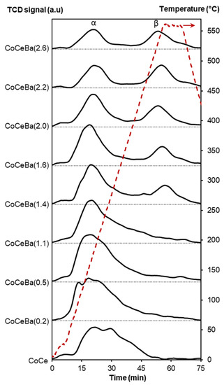The profiles of hydrogen desorbing from the surface of the promoted cobalt catalysts with different barium content are presented in Figure 2. The hydrogen desorption curves obtained for the samples containing 0–1.1 mmol Ba gCo−1 consist of one broad peak in the low-temperature range (α), extending from about 50 °C to 550 °C. Its maximum is observed at a temperature of about 170 °C. In the profiles of the samples containing 1.4 mmol Ba gCo−1 and more (i.e., in the cases where barium is in molar excess to cerium), apart from the low-temperature peak (α), a high-temperature peak (β) appears with a maximum in the range 520–550 °C. The low-temperature peak shifts slightly towards lower temperatures as the barium content in the samples increases. In the case of the high-temperature peak, the maximum changes its position slightly. However, there is no clear trend of this change. The low-temperature signal (α) corresponds to the desorption of hydrogen weakly bound to the cobalt surface. In contrast, the high-temperature signal (β) corresponds to the desorption of H2 strongly interacting with cobalt [32]. This means that samples containing barium in the content range of 0–1.1 mmol Ba gCo−1 have only weak hydrogen-binding sites on their surface. In contrast, on the surface of cobalt in the samples containing 1.4 mmol Ba gCo−1 and more, both weakly and strongly hydrogen-binding sites coexist. As the barium content increases, the intensity of the low-temperature peak decreases. The area ratio (β/α, Table 2) of peaks corresponding to strongly and weakly-binding sites on the surface of catalysts increases with barium content above 1.4 mmol Ba gCo−1, and reaches the highest value for the CoCeBa(2.2) system. Moreover, for the two systems with the highest barium content, CoCeBa(2.2) and CoCeBa(2.6), the high-temperature (β) peak begins to dominate the low-temperature (α) one in terms of the area. The observed phenomena, i.e., peak sharpening, slight temperature shifts of their location, appearance of new peaks, indicate the restructuration of the cobalt systems surface, occurring with the increase in barium content. Not only does the number of hydrogen-binding sites change, but the homogenization of their energy and formation of new types of sites also becomes visible. Therefore, it may be stated that these results support the conclusion that barium exhibits the role of a structural promoter in the studied cobalt catalysts.
