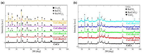 The phase composition of the selected promoted cobalt catalysts was analyzed using XRPD. The materials in the oxidized (catalyst precursors) and reduced (catalysts) forms were investigated. The recorded diffraction patterns are presented in Figure 3. Reflexes from Co3O4 are visible in the diffraction patterns of all oxidized samples (Figure 3a). However, there are no reflexes from CeO2. This may indicate the presence of a weakly crystallized or amorphous and/or highly dispersed cerium oxide. The presence of signals from two different Ba-containing phases is observed. Barium nitrate signals are clearly visible for the samples with high barium content. Barium nitrate was used for impregnation and the introduction of a substantial amount of this salt could cause a crystallization of this compound in the form of larger particles, detectable by XRPD. For the samples with low barium content, the amount of salt could be too small to form particles of a size appropriate for XRPD analysis or they were better dispersed within the samples. For the catalysts in the reduced form (Figure 3b), signals derived from Ba(NO3)2 are not detected. According to the literature reports [33], Ba(NO3)2 is transformed into amorphous BaOx species under ammonia synthesis reaction conditions. The subsequent reaction of BaOx species with atmospheric CO2 could cause the formation of BaCO3 particles (ex-situ XRPD measurements for the catalyst samples removed from the ammonia synthesis reactor). Drying barium nitrate at 120 °C should not cause the decomposition of the compound. According to the author of [34], the decomposition of pure barium nitrate occurs above 530 °C. Nevertheless, the dispersion of barium nitrate on the surface of another material significantly lowers the decomposition temperature. During drying of the catalyst precursors, the dispersed salt could presumably be partially decomposed into BaO, and due to contact with air (containing CO2), it could transform into BaCO3. Hence, there are visible signals of this phase in the catalyst precursor samples (Figure 3a).