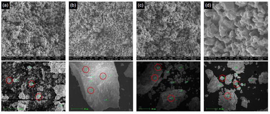 SEM images and corresponding BSE images of selected promoted cobalt catalysts in the reduced form (ex-situ measurement): (a) CoCe, (b) CoCeBa(0.2), (c) CoCeBa(1.4), (d) CoCeBa(2.2). The selected grains taken into account in the element distribution analysis (EDX) are marked in red.