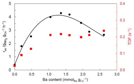 Dependence of activity of the promoted cobalt catalysts on the barium promoter content. Activity expressed as an average NH3 synthesis reaction rate (rav, ●) and TOF (■); measurement conditions: T = 400 °C, p = 6.3 MPa, H2/N2 = 3; TOF was determined based on rav values and the hydrogen chemisorption data.