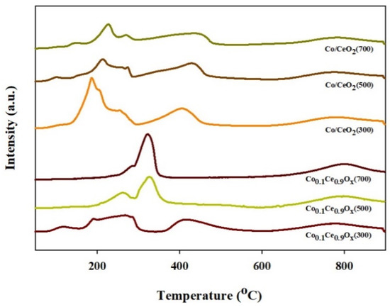 Temperature-programmed desorption after CO2 chemisorption (CO2-TPD) was performed to probe the surface basicity of each catalyst. As shown in Figure 2, there are two desorption peaks. The first occurs at temperatures less than 200 °C, and the second occurs at temperatures ranging from 200–600 °C. The low-temperature CO2-TPD peaks originate from weakly adsorbed CO2 on the catalyst surface, while the high-temperature CO2-TPD peaks indicate the strong adsorption of CO2 onto the catalyst surface. The CO2-TPD peak observed at higher temperatures implies stronger chemisorption of CO2 onto the catalyst surface. The Co0.1Ce0.9Ox(300) catalyst presents no low-temperature CO2-TPD peak, although it has two CO2-TPD peaks at high temperatures. However, all other catalysts exhibited low-temperature and high-temperature CO2-TPD peaks. These two CO2-TPD peaks were quantified, and the amounts of desorbed CO2 for each catalyst are listed in Table S1. The amount of strongly chemisorbed CO2 decreased with increasing calcination temperature for the co-precipitated catalyst (Co0.1Ce0.9Ox). The smallest amount of strongly chemisorbed CO2 was obtained for the Co0.1Ce0.9Ox(700) catalyst. Similarly, the amount of strongly chemisorbed CO2 decreased with increasing calcination temperature for the impregnated catalysts (Co/CeO2). The smallest amount of strongly chemisorbed CO2 was obtained for the Co/CeO2(700) catalyst.