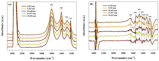 To probe the surface species during CO2 adsorption and methanation, in situ diffuse reflectance infrared Fourier transform spectroscopy (DRIFTS) study was conducted over the most active catalysts selected from co-precipitated and impregnated catalysts (e.g., Co0.1Ce0.9Ox(300) and Co/CeO2(500)). The molecularly absorbed CO2 was observed at ν = 2400-2200 cm−1 [69]. CO2 adsorption was initially performed at 40 °C (Figure 5). The typical IR peaks observed in this study are listed in Table 2. Bicarbonate and carbonate species were detected during CO2 adsorption. For the bicarbonate intermediate species, asymmetric and symmetric stretching of OCO (νasy(OCO) and νs(OCO)) were observed at ν = 1602 and 1408 cm−1 over Co0.1Ce0.9Ox(300). The same bands were observed at ν = 1654 and 1434 cm−1 over Co/CeO2(500). In addition, COH stretching for bicarbonate species (HCO3−) clearly appeared at ν = 1217 cm−1 over Co0.1Ce0.9Ox(300), while it was not observed for Co/CeO2(500). For the carbonate species, monodentate and bidentate were confirmed over Co/CeO2(500) at νasy(OCO) = 1475 and 1577 cm−1 and νs(OCO) = 1380, 1331, and 1265 cm−1, while the symmetric OCO peak centered at ν = 1293 cm−1 was detected for Co0.1Ce0.9Ox(300). During CO2 adsorption at 300 °C (Figures S9 and S10), the bicarbonate and carbonate species also occurred at the same position as at 40 °C. However, the noticeable difference during CO2 adsorption at low and high temperatures is the weak and broad peaks of adsorbed CO* species on the metallic cobalt at ν = 2184, 2142, 2045, and 2119 cm−1 over Co0.1Ce0.9Ox(300) and Co/CeO2(500). This implies that the C=O double bond in the CO2 molecule can be broken down to generate CO* intermediates at high temperatures.