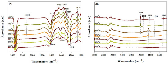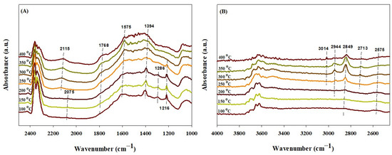 In situ DRIFTS spectra during CO2 methanation at temperatures of 100-450 °C over the Co0.1Ce0.9Ox(300) catalyst in the range of 2500–1000 cm−1 (A) and 2500-4000 cm−1 (B). The feed is composed of 1 mol% CO2, 49 mol% He, and 50 mol% H2.