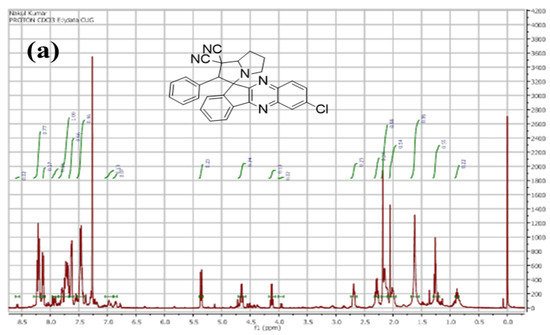 Spiro derivatives were prepared by an asymmetric 1,3-dipolar cycloaddition between chloroindenoquinoxaline and the starting materials (a product of malononitrile and aldehydes). Preliminarily, the reaction of the Spiro pyrrolizidines derivative I–VIII was carried out in acetonitrile solvents using chloroindenoquinoxaline and L-Proline under reflux for 3 h. The afforded moderate yield for Spiro I—86%, Spiro II—84%, Spiro III—79%, Spiro IV—83%, Spiro V—87%, Spiro VI—95%, Spiro VII—89%, and Spiro VIII—91% were obtained. In this context, Huang et al. [13] reported decorated Spiro pyrrolidines derivatives by incorporating both the bioactive moieties in a single structural framework. Tan et al. [14] have studied an efficient synthesis of 9-anthrone lactone derivatives via Knoevenagel condensation towards efficient biological applications. However, in the present scenario, we introduced a facile method to prepare the Spiro pyrrolidines and Spiro pyrrolizidines derivatives under a 1,3-dipolar cycloaddition reaction [15,16].