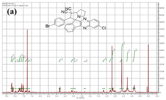 To identify the various functional groups involved in synthesized heterocyclic Spiro compounds, the FTIR technique was performed, and the spectra were taken at room temperature (25 °C). Spiro I: stretching vibrational frequency of the functional groups (–CH, –CN, –CH3, –C–Cl) appeared at around 2850, 2250, 1450, and 800 cm−1, respectively, as shown in Figure 9a. Spiro II: stretching vibrational frequency of the functional groups (–C–F, –CN, –CH3, –C–Cl) appeared at around 1350, 2250, 1450, and 800 cm−1, respectively, as shown in Figure 9b.