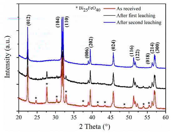 Figure 2 depicts the room temperature X-ray diffractogram of the BFO sample, as fabricated and leached ones at the most relevant diffracting windows for BFO (20° to 60°).