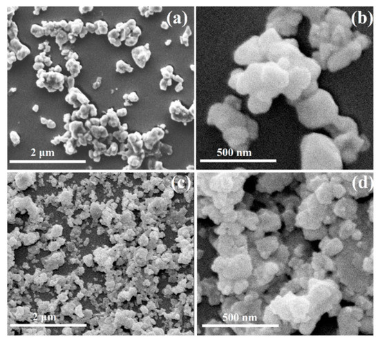 SEM images of the sprayed BiFeO3 samples on a silicon substrate, with an initial powder with (a,b) no second milling, and (c,d) 8 h of second milling at different magnifications.