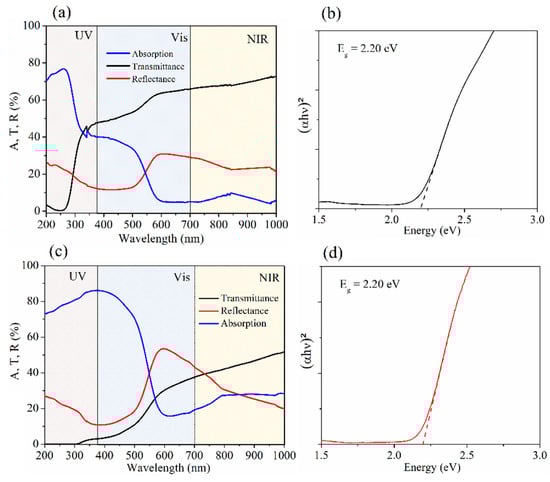 Absorption, transmittance, and reflectance of BiFeO3 deposited on a glass substrate with (a) no second milling, (c) with 8 h of second milling of the initial powder. Their respective Tauc plots are illustrated in (b,d).