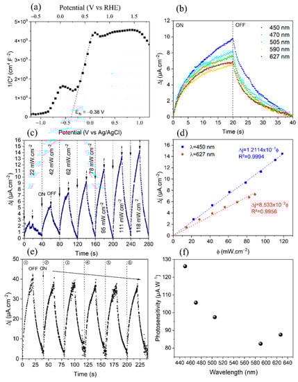 In this section, the potential of the BFO sample for photocurrent generation is examined. Figure 7a present the Mott–Schottky plot 1/C2(E) of BFO film deposited on a Pt/Si substrate. From the resulting positive slope, we can conclude about an n-type semiconductor type with a flat band potential Efb = −0.38 V vs. Ag/AgCl or 0.231 V vs. RHE (at pH = 7). Potentials vs. Ag/AgCl were converted to potentials vs. RHE with following equation []: