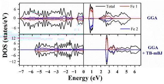 Note that the magnetic properties of the BFO system were considered in our calculations, and both ferromagnetic (FM) and antiferromagnetic (AFM) configurations were studied. It was found that the lowest energy was obtained for the AFM configuration of the BFO system, which agrees well with the literature review [,]. In addition, we used two different approximations to ensure the accurate description of the electronic properties of the studied AFM bulk BFO system (Figure 8). We first considered the generalized gradient approximation (GGA) to consider the effect of gradients into the charge density, which is known to improve the calculation of the cohesive energy. From Figure 8, we can observe an extremely low band gap energy of 0.5 eV using the GGA approximation which is still far from the well-known band gap of BFO system (i.e., ~2.7 eV) [,].